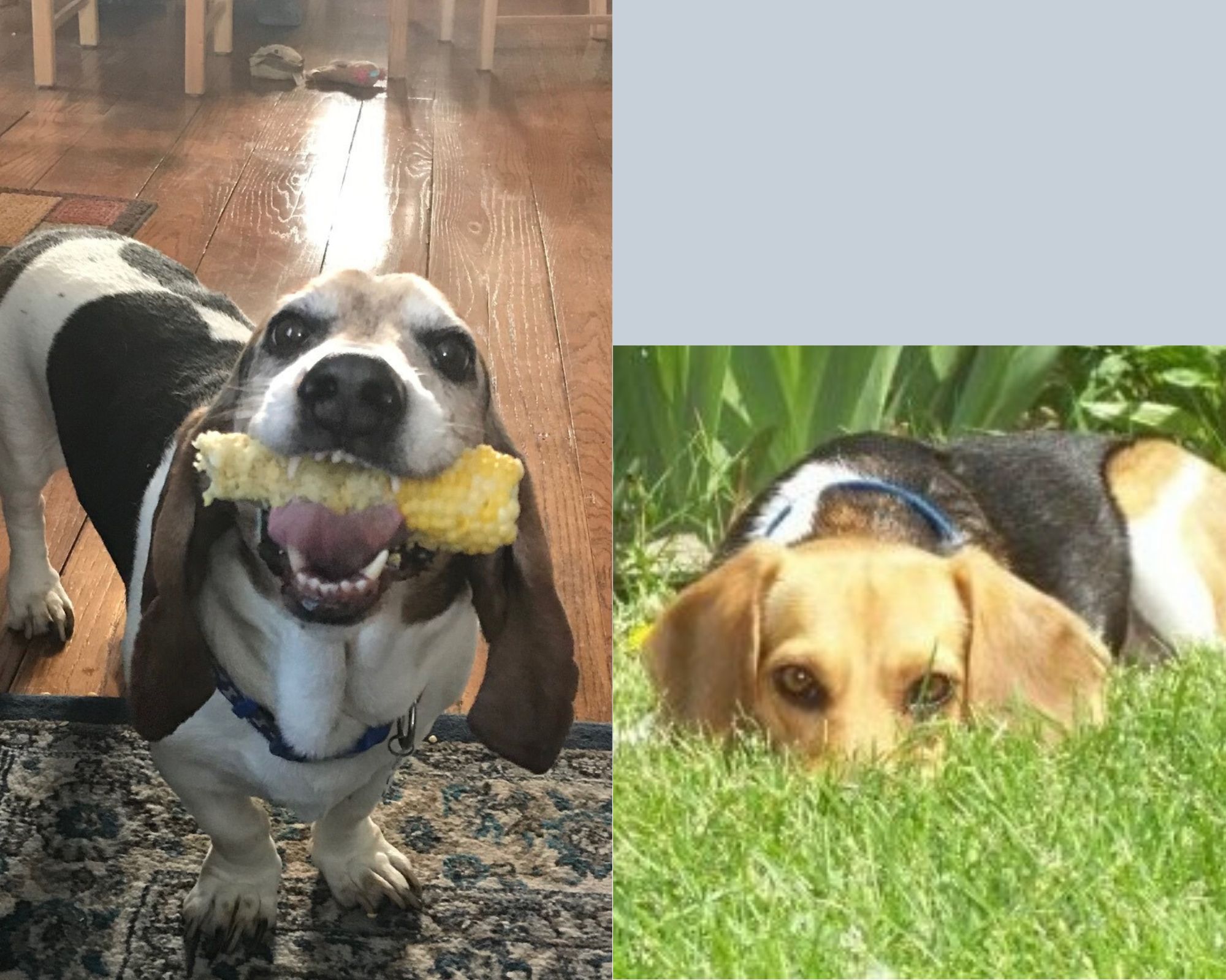 Colonel Roscoe T. Longbottom (left) is a Bassett hound. (8 years old, but photos from his younger days.) Daisy May Underfoot (right) is a beagle. (13 yo; photo from when she was 3.) Colonel Roscoe and Daisy's human is John.